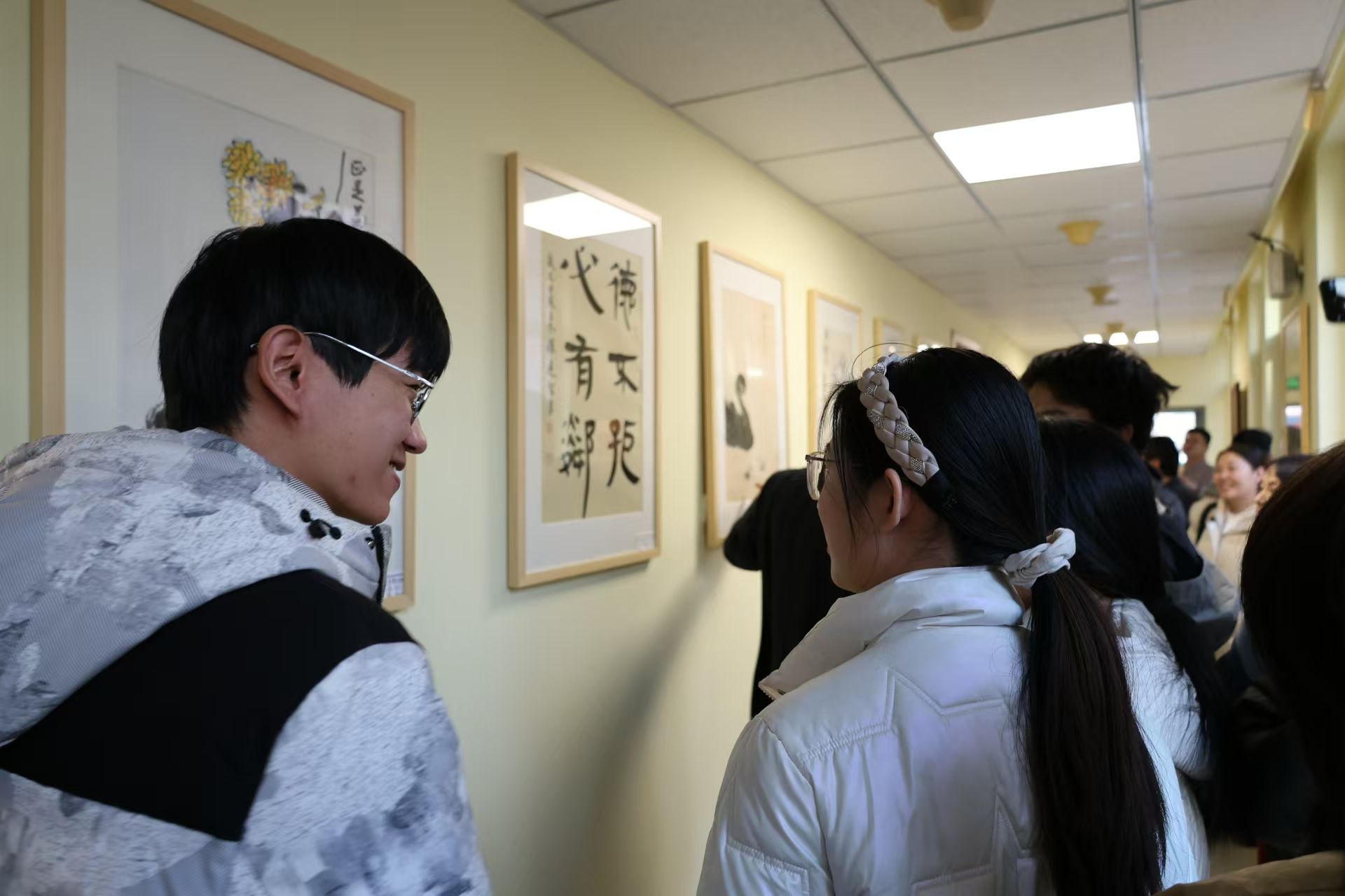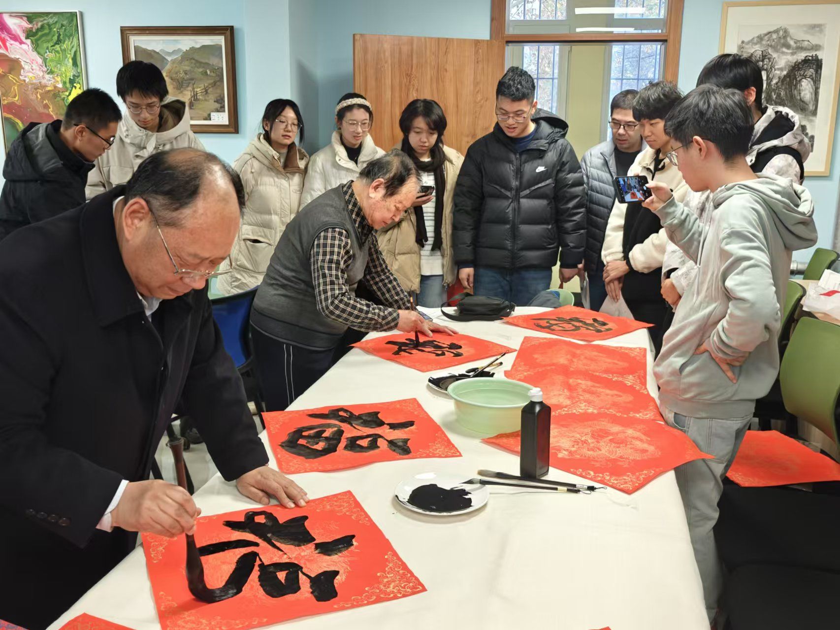 Artists also collaborated with students to create traditional calligraphy, writing “Fu” characters, which symbolize blessings and good fortune in Chinese culture, to welcome the New Year. Liu Kai, a graduate student, shared, “This exhibition brings art closer to us. We don’t have to visit a gallery; instead, we can engage with art in our daily lives, making it a real and accessible part of our routines.”