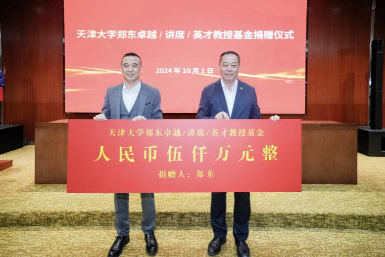 On National Day, October 1st, coinciding with the 129th anniversary of Tianjin University, Zheng Dong, an esteemed alumnus from the class of 1988, returned to his alma mater to donate 50 million yuan. This generous contribution will establish the "Tianjin University Zheng Dong Excellence/Lecture/Distinguished Professor Fund," aimed at recognizing teaching staff, expressing gratitude to Tianjin University, and supporting the construction of a strong educational nation. The donation ceremony took place in the 1895 Administration Building, attended by Tianjin University Party Secretary Yang Xianjin, Vice Party Secretary Lei Ming, Vice President Zheng Gang, and other representatives from the university and alumni associations. The ceremony was presided over by Mr. Pan Feng, Director of Alumni and Fund Affairs and Secretary General of the Tianjin University Peiyang Education Development Foundation.