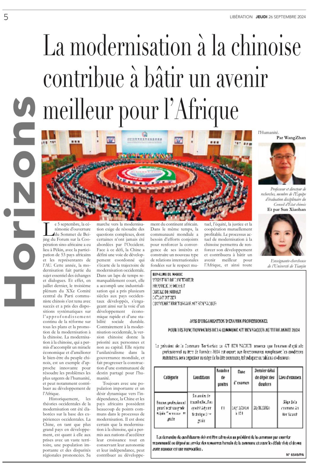 On September 26, 2024, Professor Wang Zhan and Lecturer Sun Xiaohan from the School of Foreign Languages, published a commentary article in the prominent Moroccan newspaper La Libération. Titled "Chinese path to modernization Contributes to a Better Future for Africa," the article discusses the potential of Chinese modernization to aid African development and deepen Sino-African friendship.