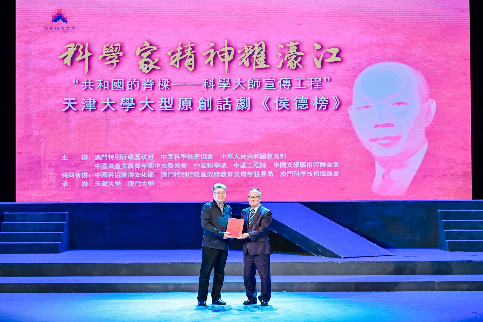 During the performance, Hou Debang’s family members attended the event. His grandson, Hou Shengzheng, presented the book “Hou Debang: A Titan of Science” to Song Yonghua, President of the University of Macau. Additionally, a themed exhibition titled “A Titan of Science, A Model of Scholarship,” co-curated by Tianjin University and Tianjin Bohua Yongli Chemical Industry Co., was displayed at the venue. The exhibition offered attendees an opportunity to explore Hou Debang’s life and contributions before the performance, showcasing the scientist’s legacy from multiple perspectives.