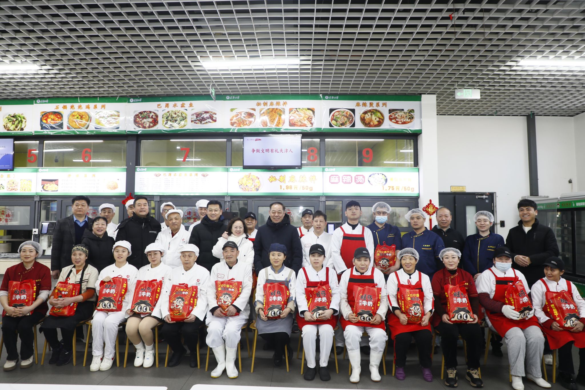 Yang Xianjin and his team visited the Datong Student Center at Peiyangyuan Campus to meet with students staying on campus, where they handed out the New Year gift packs and campus cards. Yang Xianjin inquired about the students' academic and daily life, and their plans for the holiday. He encouraged the students to balance work and rest during the winter break, stay in touch with their families, and send them best wishes. He also wished them good health, success in their studies, and personal growth.