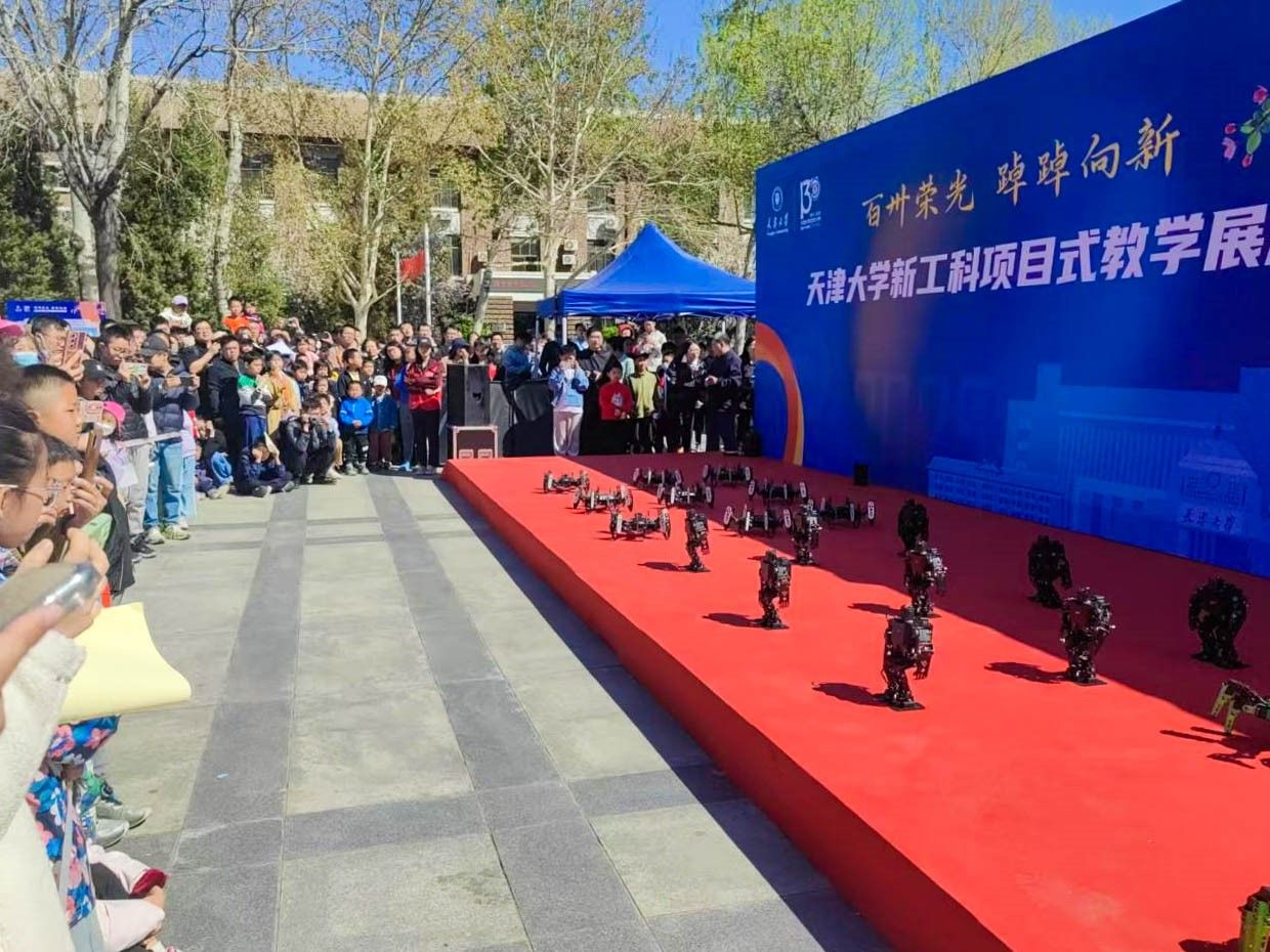 Inside the Popular Science Education Base of Smart Machines, achievements such as robotic arms, laser printing, and quadruped robotic dogs attracted the attention of teachers, students, and parents from dozens of middle schools. Professor Yu Heyang demonstrated the grasping and assembly functions of a six-axis robotic arm. Students personally operated the control handle to complete complex commands, and learned about its application potential in the industrial field through practice. Professor Bai Ruifeng showcased the laser printing technology, precisely engraving four characters “天津大学(meaning Tianjin University)” on the display board. The quadruped robotic dog equipped with an AI visual system became a popular star with its difficult moves like dancing and doing push-ups, vividly illustrating the cutting-edge development of embodied intelligence.
