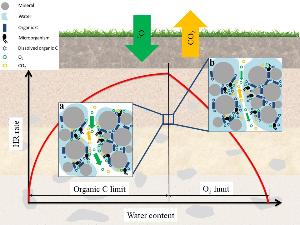 Soil heterotrophic respiration (HR) is an important source of soil-to-atmosphere CO2 flux, but its response to changes in soil water content (θ) is poorly understood. Earth system models commonly use empirical moisture functions to describe the HR–θ relationship, introducing significant uncertainty in predicting CO2 flux from soils. Generalized, mechanistic models that address this uncertainty are thus urgently needed. Researchers from Tianjin University and the University of Maryland derived, tested, and calibrated a novel moisture function, fm, that encapsulates primary physiochemical and biological processes controlling soil HR. They validated fm using simulation results and published experimental data and established the quantitative relationships between parameters of fm and measurable soil properties, which enables fm to predict the HR–θ relationships for different soils across spatial scales. The fm function predicted comparable HR–θ relationships with laboratory and field measurements and may reduce the uncertainty in predicting the response of soil organic carbon stocks to climate change compared with the empirical moisture functions currently used in Earth system models.