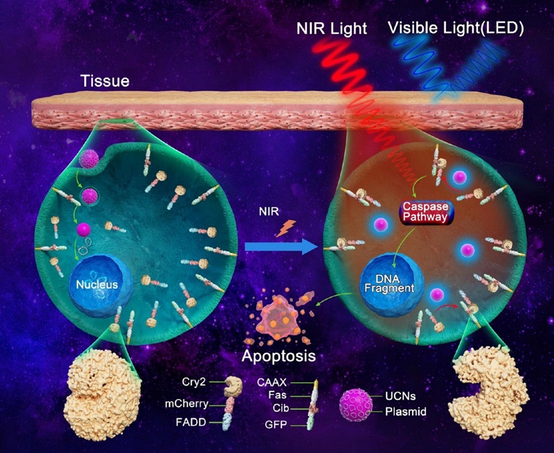 A research team from the School of Life Sciences of Tianjin University, led by Professor Chang Jin, have developed a versatile up-conversion optogenetic nanosystem based on a blue-light-mediated heterodimerization module and rare-earth up-conversion nanoparticles (UCNs). The UCNs worked as a nanotransducer to convert external near-infrared (NIR) light to local blue light to non-invasively activate photoreceptors for optogenetic manipulation in vivo. The research is expected to provide a new minimally invasive treatment for malignant tumors. The research paper, Near-Infrared Light Triggered Up-conversion Optogenetic Nanosystem for Cancer Therapy, was published in ACS Nano, an internationally famous nano-science journal.