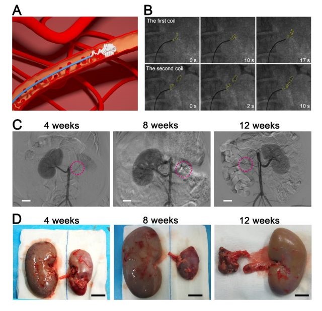 In order to explore the effect of embolization in vivo, the team preformed a radiopaque gel into a microcoil which were straightened at an elevated temperature, and fixed at a low temperature; then the straight hydrogel strip was delivered to the pig’s renal artery by an interventional catheter under protection of cooled saline. Upon contact with "warm blood", the gel strip rapidly transformed into a coil. Delivering several coils in succession could efficiently embolize the renal artery. At 12 post operation, the hydrogel coil remained very stable in the blood vessels, and no recanalization phenomenon was observed. Anatomical and staining results showed that the kidneys in the embolized area became necrotic. This self-imaging shape memory coil is expected to open a new avenue to treat aneurysm.