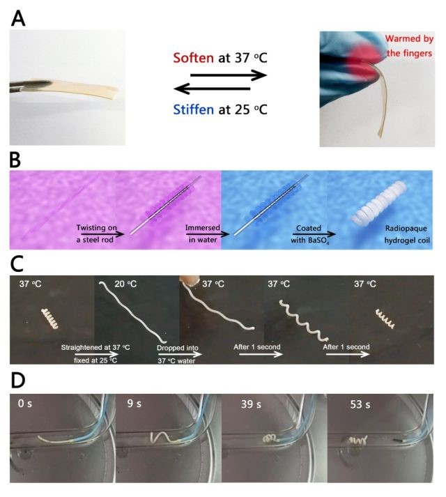 Figure 1. (A) Photos depicting the thermoreversible softening?stiffening transition. (B) Schematic illustration of the fabrication of radiopaque TAE hydrogel coils. (C) The SM procedure of the hydrogel coil in an unconfined environment. (D) In vitro shape recovery of the hydrogel coil from initial straight strip, which was delivered through a catheter into the glass tube immersed in 37 °C water.