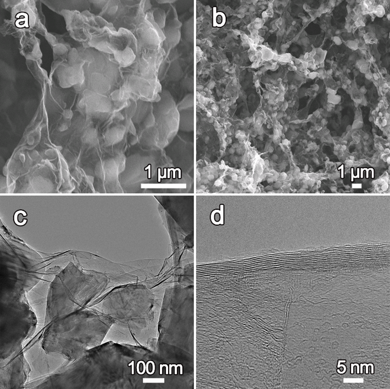 Figure 2. (a,b) Scanning electron microscopy and (c,d) transmission electron microscopy images of as-prepared 3Dgraphene foams. Graphene was grown in-situ on the surface / interface of sintered metal particle skeleton, and finally the 3D graphene foam was made up of 2D graphene layers and carbon shell. The 3D graphene foam presented a porous structure, and the carbon shell was connected by 2D graphene layers. Graphene had a multi-layer structure, and the specific surface area was up to 1080 m2 g-1.