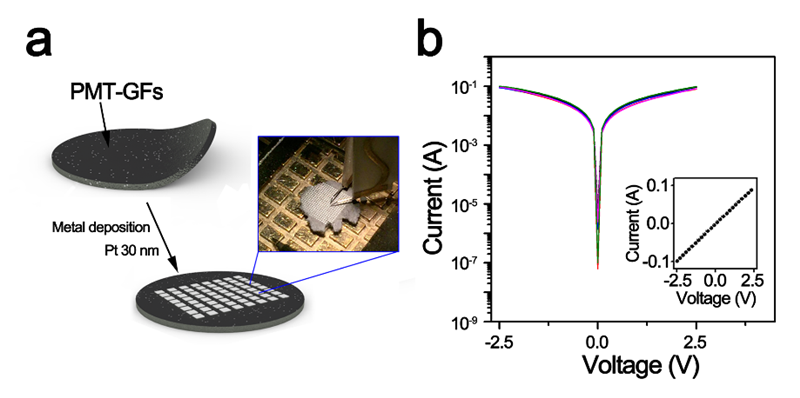 Figure 4. (a) Schematic diagram of room-temperature electrical conductivity testing of 3D graphene foam. (b) Current?voltage curve. The two-electrode method was used to test the room-temperature electrical conductivity of the product, and the result was 13.8 S cm-1, which showed a well conductivity.