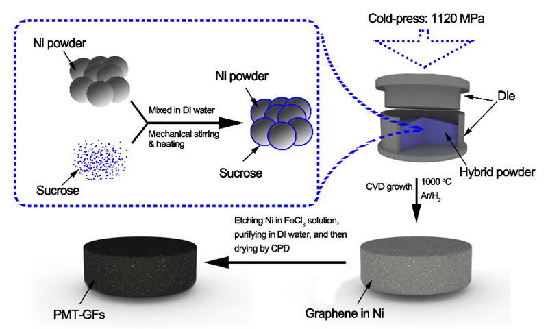 In Cooperation with J. Tour’s team, Professor Zhao’s research group used metal powder as a template and sucrose as a carbon source, and made sucrose well-coated on the surface of metal powder particles through mixing. Metal-matrix composites, formed by traditional powder metallurgy method of cold pressing, were obtained by heat treatment with the protection of argon/hydrogen mixed atmosphere. Finally, the in-situ growth of 3D graphene foam was obtained in only one step.