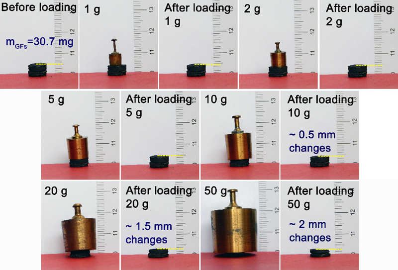 Figure 3. Digital photos of 3D graphene foams before and after loading different weights. The product has good structural stability and can keep in good condition under the action of water. It can bear more than 150 times the weight of itself, and achieves rebound after unloading.