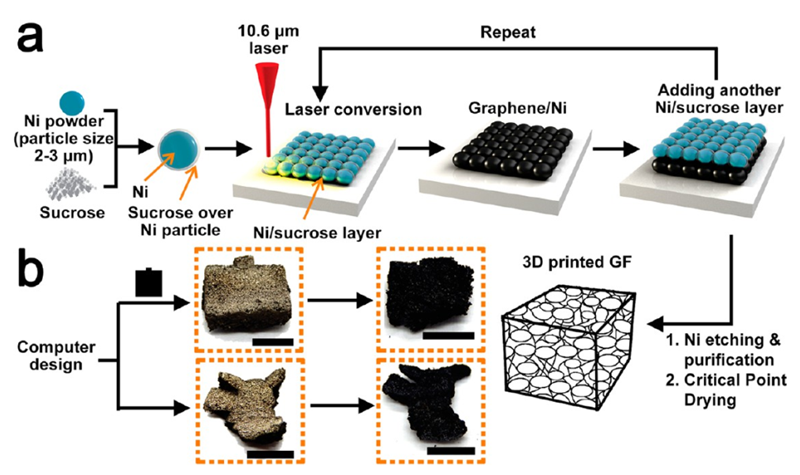 It is found that 3D printed GF have similar properties compared with GF grown by CVD, such as comparable electrical conductivity (~8.7 S/cm), energy storage modulus (~11 kPa) as well as a higher damping capacity (Tan Delta: ~0.06). This simple yet efficient method requires neither cold-press molds nor high-temperature CVD treatment. In addition, various 3D carbon materials could be produced by changing the precursor’s composition. The 3D printed GF will be extensively applied to energy storage devices, catalyst, damping materials and many other fields.