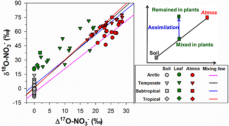 Supported by the Key Project (Grant No. 41730855) and Outstanding Youth Foundation (Grant No. 41522301) of Natural Science Foundation of China, Prof. Xue-Yan Liu in the Institute of Surface-Earth System Science of Tianjin University investigated sources and utilizing mechanisms of nitrate in plants of arctic tundra, temperate and tropical/subtropical forests with researchers in Kyoto University of Japan and Marine Biology Laboratory of USA. By applying novel methods of N and oxygen isotopes geochemistry in combination with parameters of soil N, plant N uptake and enzymatic reduction, they revealed that nitrate is an important N source for arctic tundra plants. This finding updated the knowledge of plant N availability in arctic tundra, which is critical for better understanding N and carbon cycling dynamics in arctic ecosystems and their responses to environmental changes. Moreover, this study quantified the direct acquisition of nitrate by plants in low-latitude regions and highlighted the importance and challenge to further investigate influences of atmospheric N pollution on soil N loading and plant N use.