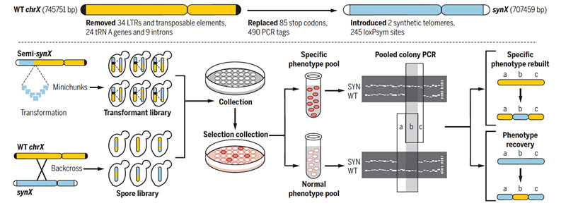 Certain genetic alternations in the chromosome would affect cell fitness and cause “bugs”; debugging is therefore imperative for successfully building a synthetic genome. The malfunction of synthetic genomes remains one of the most common obstacles, as it is difficult to uncover the underlying reasons. In a bid to tackle this problem, TJU developed a highly efficient debugging method called pooled PCRTag mapping (PoPM) by using a pooling strategy and the Sc2.0 PCRTag system, which is generalized to watermarked synthetic chromosomes. PoPM is a powerful tool for synthetic yeast genome debugging which accelerated the progress of the whole Sc2.0 project. “During synX assembly, the PoPM method was applied to identify and eliminate genetic alternations that affect cell fitness, sequences we refer to as “bugs”, and several details of yeast biology were uncovered by debugging. PoPM represents an efficient strategy for phenotype-genotype mapping which will be applicable for expanding understanding of yeast genomic and cellular functions” according to Wu.