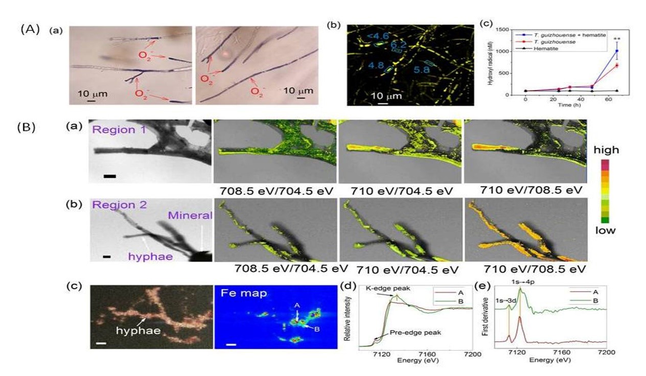During cultivation, a high concentration (~1000 nM) of hydroxyl radical was also detected. Synchrotron radiation based spectromicroscopies at fungus-mineral interfaces suggest that fungus hyphae alter the local redox state of iron and thus are redox-active.