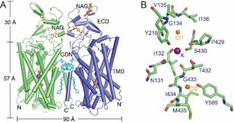 Figure A: Overall structure of human KCC1 exists as a dimer; Figure B:A zoom-in viewshowing the binding sites of K+and Cl-in KCC1