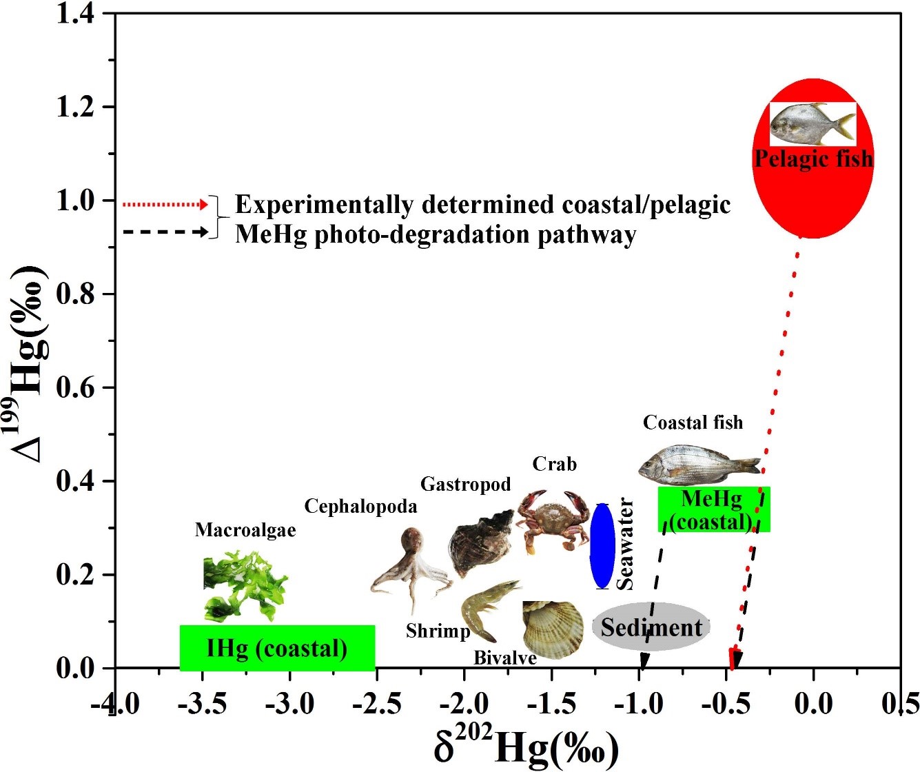 Dr. Meng Mei, Prof. Sun Ruoyu and Prof. Chen Jiubin from Tianjin University’s Institute of Surface-Earth System collaborated with researchers from the Research Center for Eco-Environmental Sciences at the Chinese Academy of Sciences and investigated a large-scale food web (macroalgae/hydrophyte, mollusks,crustaceans (shrimp, crab), coastal/pelagic fishes), seawater, and sediment from Chinese Bohai Sea. They analyzed the speciation and isotope composition of the mercury along with ecological tracers such as carbon and nitrogen isotopes. The results show that the MeHg concentrations in most of the marine biota in the Bohai Sea are lower than the maximum permissible limit of MeHg for seafood in China, which are therefore safe to eat; the trophic transfer of MeHg in food webs is unlikely fractionate Hg isotopes, providing a solid theoretical basis for tracing the geochemical transformation of Hg in aquatic environments using Hg isotope composition in food webs; and MeHg in the Bohai food web was likely derived from the methylation of inorganic Hg in marine sediments, while the contribution from methylation of inorganic Hg in seawater was not significant, provides a theoretical basis for future environmental management. Interestingly, the researchers observed for the first time significant negative anomalies in mass independent fractionation of 200Hg, providing new insights in using even Hg isotopes to study the Hg cycling in marine food webs.