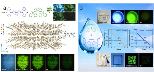 Long-persistent luminescence is a unique photophysical phenomenon, which generally exists in inorganic materials. The inorganic long-persistent luminescence materials have been widely applied in the fields of luminescence lighting and biological imaging. Compared with inorganic long-persistent luminescence materials, organic long-persistent luminescence (OLPL) materials pose attractive application prospects in many high-tech fields such as bio-imaging, optical recording, information storage and anti-counterfeiting systems due to their low price, simple synthesis, good bio-compatibility and easy modification of functional groups. However, since purely organic long-persistent luminescence phenomena can usually be observed only under harsh conditions such as very low temperature and oxygen-free environment, it is a great challenge to achieve efficient purely organic long-persistent luminescence emission at room temperature and in atmospheric environment.