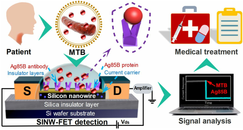 Recently, a research team led by Professor Can Wang at the School of Environmental Science and Engineering has developed a new type of silicon nanowire field effect tube (SiNW-FET) biosensor for rapid and sensitive detection of MTB. The Ag85B protein, a typical MTB marker, was selected as the target to be detected. The surface functionalization parameters of the biosensor were explored and optimized, and the best-operating conditions were obtained. The SiNW-FET biosensor has good sensitivity, reproducibility and stability. The LOD of MTB Ag85B protein is 0.01 fg/mL, and there is a linear relationship between the current signal and the protein concentration in the range of 1 fg/mL-100n µg/mL, which can be initially used for quantitative detection. The entire test cycle can be completed in as soon as 30 seconds.