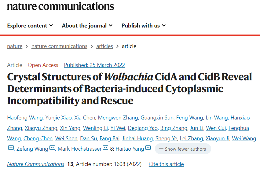 On March 25, 2022, professor Zefang Wang’s team from the School of Life Sciences, Tianjin University published a paper in Nature Communications titled "Crystal Structures of Wolbachia CidA and CidB Reveal Determinants of Bacteria-induced Cytoplasmic Incompatibility and Rescue", reporting the artificial manipulation achievement of cytoplasmic incompatibility (CI) by designing CI factors from Wolbachia.