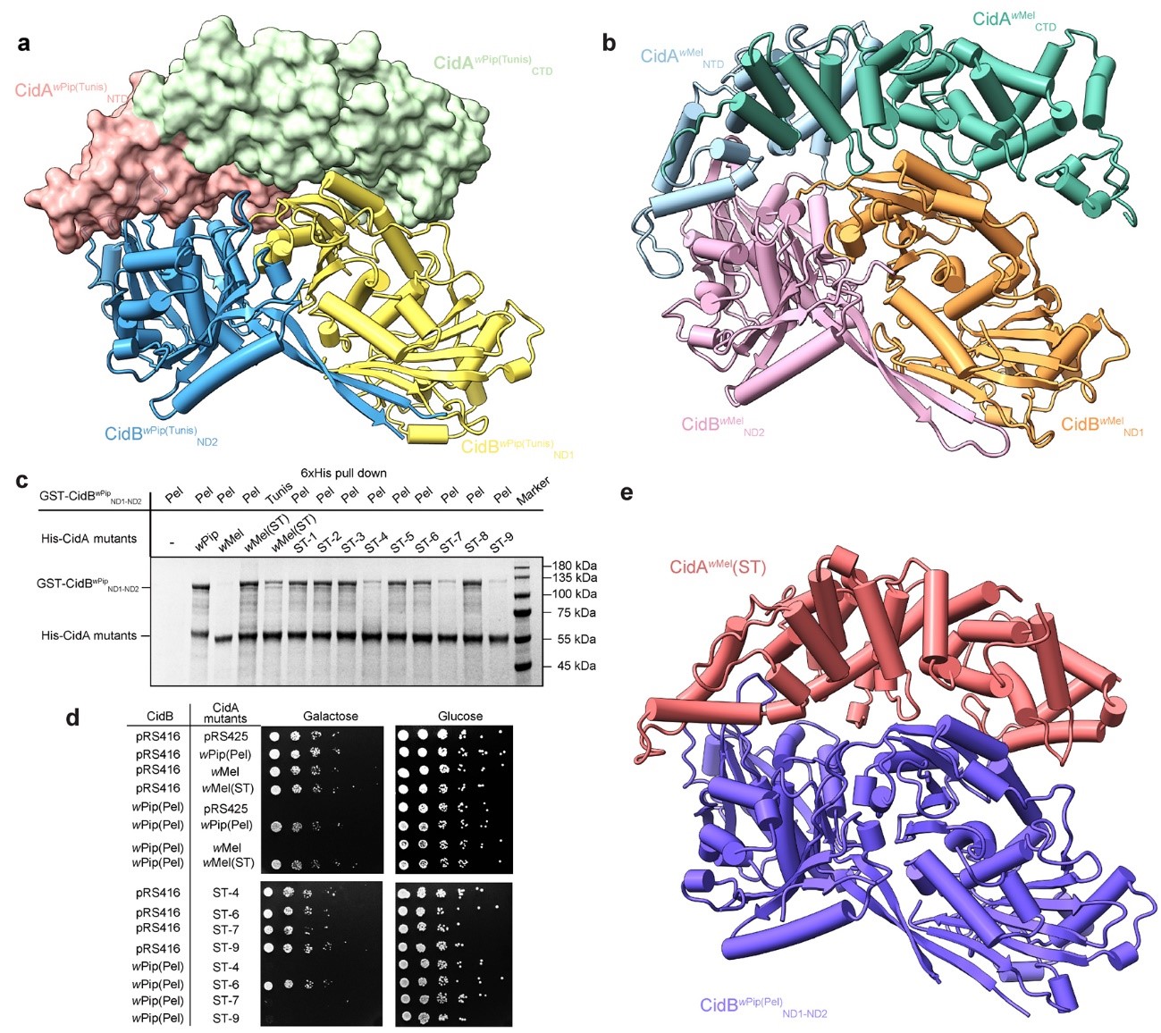 Fig. 1 Artificially designed CI factors manipulate CI generation and rescue.a3D structure of CidAwPip(Tunis)-CidBwPip(Tunis)ND1-ND2complex.bModel of CidAwMel-CidBwMelND1-ND2complex predicted by Alphafold.cThe artificial chimeric protein CidAwMel(ST) can interact with CidBwPipfrom different strains. Revertant mutation of the interface amino acid makes the mutant protein unable to interact with CidBwPip, and regions 4, 7 and 9 play an important role in binding.dThe artificial chimeric protein CidAwMel(ST) canrescue the CidBwPip-induced growth defects in yeast.e3D structure ofCidAwMel(ST) -CidBwPip(Pel)ND1-ND2compelx.