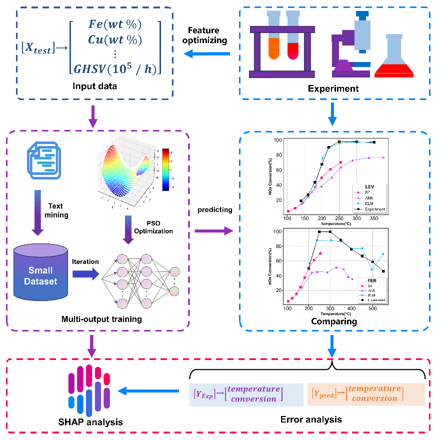 The model explicitly characterizes the temperature-conversion relationship using a multi-output regression structure, enhanced by feature weighting and dynamic sampling mechanisms. It significantly improves the model’s capacity to capture complex parameter interactions and temperature dependencies. In tests involving limited data samples, the framework achieved a prediction accuracy improvement of up to 93.3% in NOx conversion. Moreover, the prediction speed increased by approximately 87% compared to conventional neural networks and random forest models, requiring only 0.2–0.3 seconds per inference.