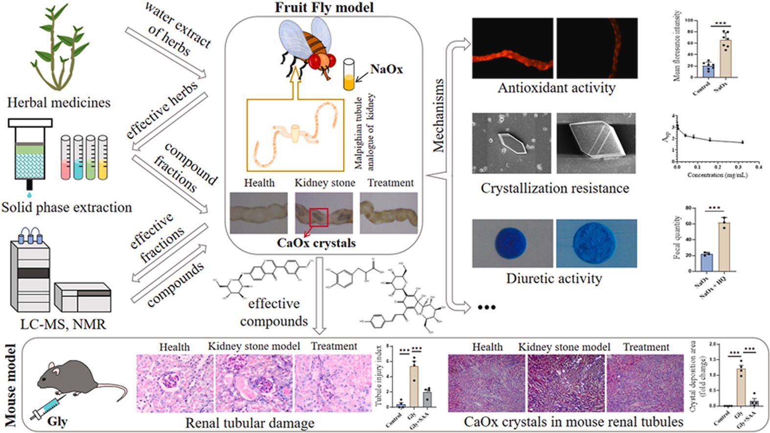This study establishes a comprehensive research paradigm — “Drosophila screening – chemical analysis – mammalian validation” — and identifies three novel candidate compounds for nephrolithiasis treatment. It lays a solid material foundation for future drug development. By integrating the Drosophila model with chemical separation and identification techniques, this efficient strategy demonstrates the model’s value in discovering bioactive compounds from complex herbal mixtures and contributes to the modernization of TCM research.