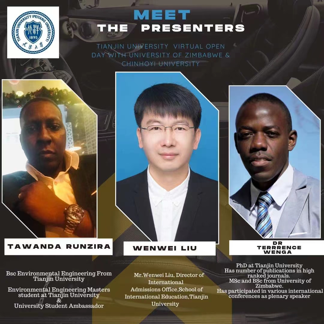 Speakers: Liu Wenwei, Director of International Admissions Office, School of International Education, Tianjin University; Tawanda Runzira, Environmental Engineering Master's student and student ambassador at Tianjin University; Dr. Terrrence Wenga, PhD at Tianjin University