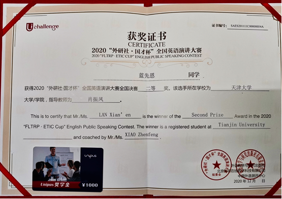 On December 20, 2020, Lan Xian’en, a graduate student from the Institute of Molecular Plus (IMP) won the second prize in the 2020 “Uchallenge” National English Speech Contest for College Students, as was announced by Foreign Language Teaching and Research Press Unipus, a WeChat public account. This is the highest award students from Tianjin municipality have won in this contest this year.In ...