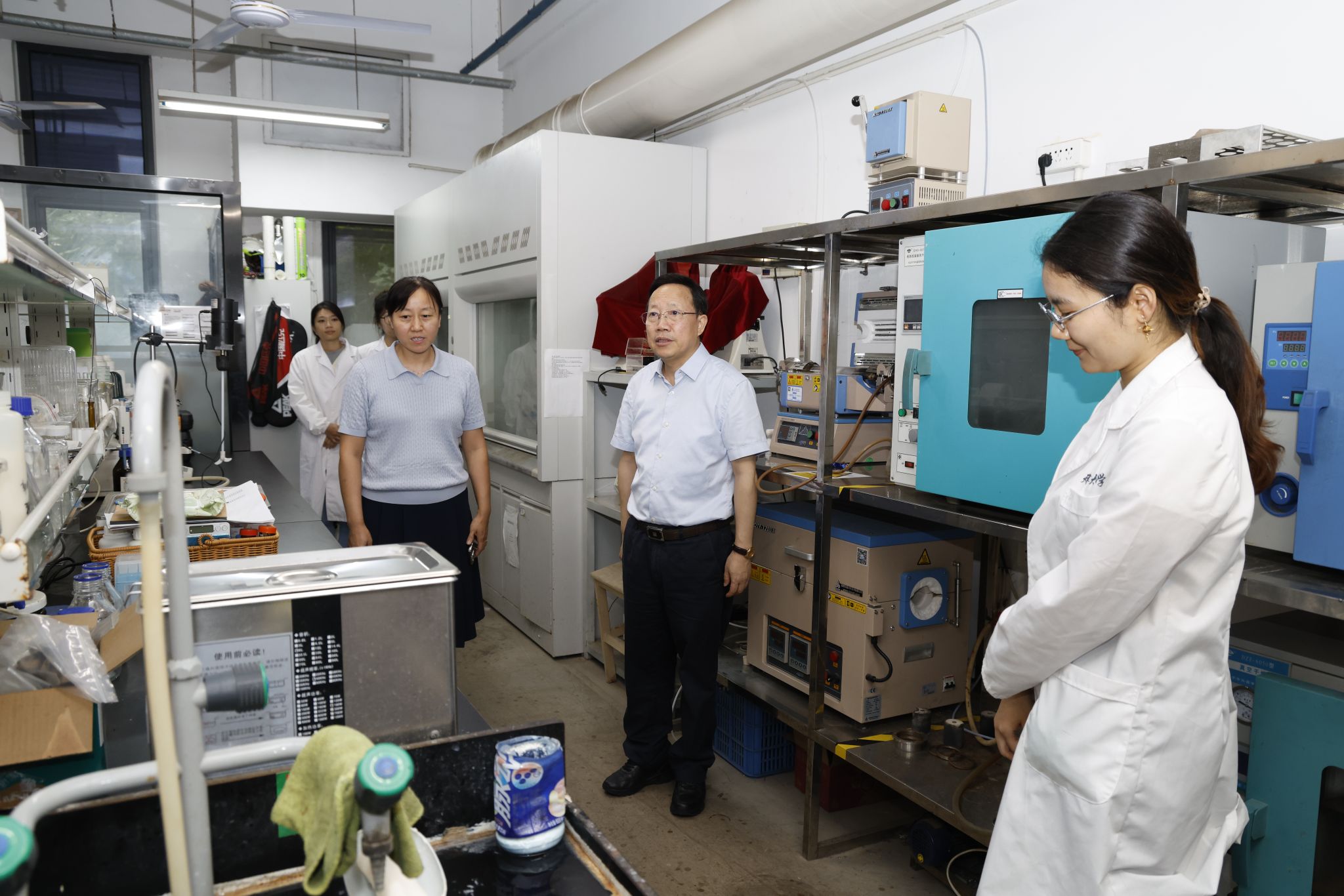 The delegation first visited a laboratory within the School of Science, where President Chai engaged in warm conversations with students conducting research. He inquired in detail about their research topics and experimental progress.