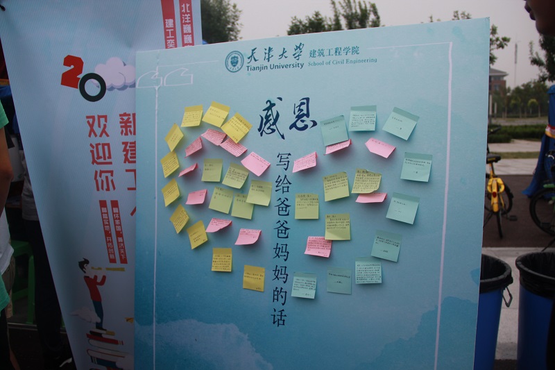 Entering the university also means that we are about to be away from our parents and live independently. The School of Civil Engineering set up a special Thanksgiving wall on which new students could write of their gratitude to their parents. A freshman Wen Shiying wrote, “Thank you, my parents. Although I don’t often say I love you, my love is in the bottom of my heart.”