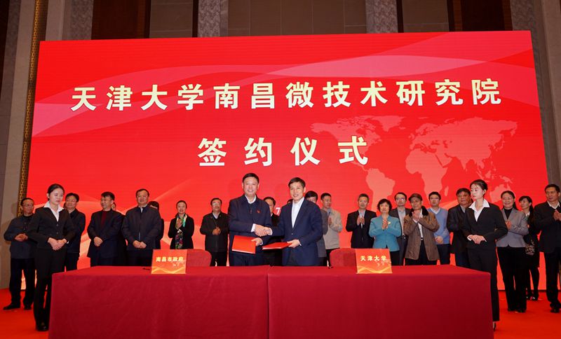 Leaders from Tianjin University including Party Secretary Li Jiajun, President Zhong Denghua, the former Vice President Hu Xiaotang, and from Jiangxi province including Yin Meigen, a member of the Standing Committee and Vice Governor of Jiangxi Province, and Guo An, the Mayor of Nanchang. Li Jiajun and Yin Meigen spoke about the need to strengthen cooperation between Tianjin University and Nanchang city to enhance confidence for better on-going research and development of the Institute. Zhong Denghua and Guo An signed the project cooperative agreement for the Tianjin University-Nanchang Micro Technology Research Institute to be constructed in Nanchang.