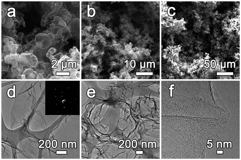 Figure 2 SEM images (a-c) and TEM images (d-f) of 3D printed GF.