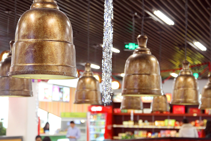 The dining hall is decorated with Christmas bells