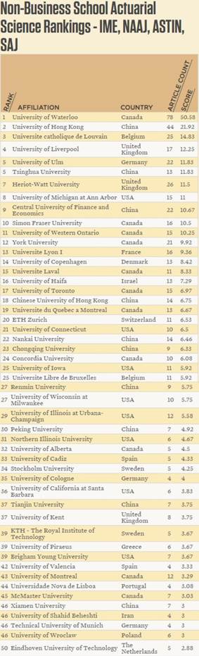 The UNL Actuarial Science Program in the Department of Finance in the College of Business has set up a database to track all papers published since 1990 in the leading risk and insurance journal and in four leading actuarial journals. Rankings are provided for the top 20 North American and the top 50 worldwide business and non-business schools respectively according to the cumulative number of their respective faculty members’ publications in these journals. These rankings are given for degree-awarding schools. We are grateful for the funding support for this rankings database from American Life Insurance Corp (quoted in part from the UNL official website).