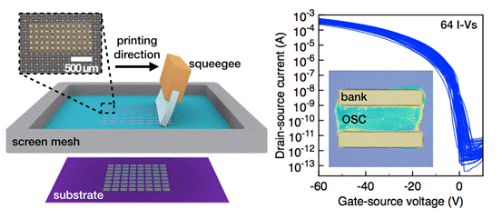 By employing cross-linkedorganic polymer banks to constrain the OSC (organic semiconductor) crystallization, the team realized scalable fabrication of highly crystalline organic semiconductor thin film by screen printing toward the low-cost fabrication of high-performance transistor arrays for the first time as shown in figure 1, (Adv. Mater.2019,31, 1807975).