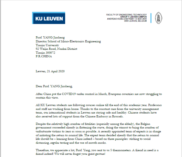 The School of Microelectronics also donated five temperature guns to KU Leuven and expressed great concerns for the well-being of its students and staff. On April 21, the School received a letter of thanks from KU Leuven. The letter wrote "A friend in need is a friend indeed! We will never forget your great gesture!" In the letter, KU Leuven highly praised the good deeds of the School of Microelectronics, and proposed that the two sides would further strengthen cooperation and exchanges in the future.