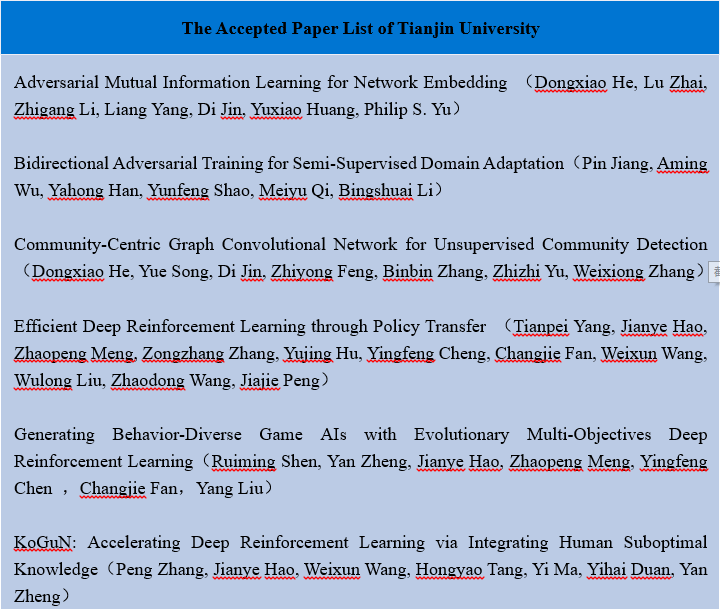The International Joint Conference on Artificial Intelligence and the 17th Pacific Rim International Conference on Artificial Intelligence (“IJCAI-PRICAI 2020”) have released the paper list accepted by the conferences recently. Ten papers from Tianjin University’s College of Intelligence and Computing are among the list.