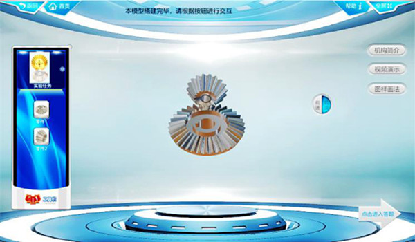 While observing the mechanical structure and its principle, the students disassemble and assemble the oil pump gears. It is the virtual simulation technology that creates the teaching building and gear components. Students can complete a series of experiments online at home.