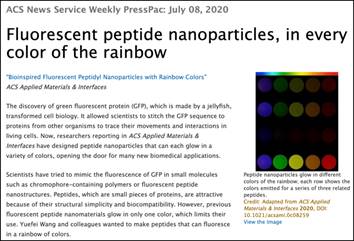 On July 8, the ACS (American Chemical Society) Weekly PressPac released a news about the research on fluorescent peptide nanoparticles with rainbow colors conducted by Dr. Wang Yuefei’s team from Tianjin University’s School of Chemical Engineering and Technology under the supervision of Prof. Qi Wei. The news is as follows and the original link is https://www.acs.org/content/acs/en/pressroom/presspacs/2020/acs-presspac-july-8-2020/fluorescent-peptide-nanoparticles-in-every-color-of-the-rainbow.html.