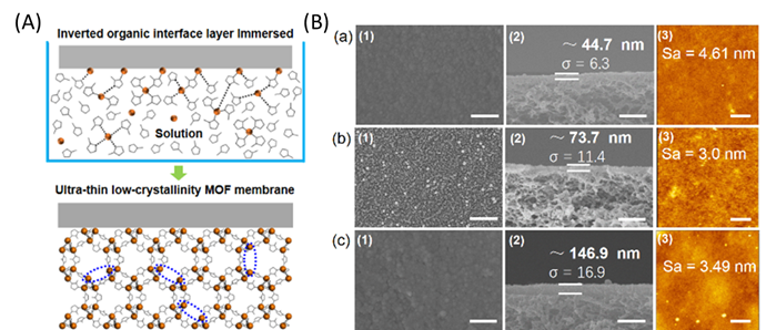 (A) Representation of the formation process of supported ultrathin LC-MOF membranes. (B) SEM surface images, SEM cross-sectional images and AFM images of (a) DZIF-8-1, (b) DZIF-8-2 and (c) DZIF-8-3 LC-MOF membranes.