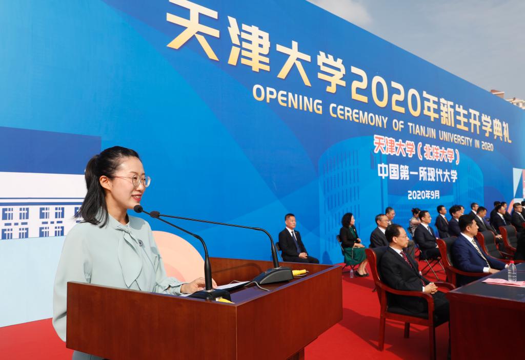 The Welcoming Ceremony opened with the loud national anthem. President Jin Donghan delivered a speech at the ceremony, sending expectations and blessings to the new students. Professor Yan Guangfen, the Dean of the School of Education, and Zhao Danning, a 2019 graduate student, spoke on behalf of the teachers and students respectively to welcome the new students. Tan Jianing, a 2020 undergraduate student majoring in Chemical Energy and Life Medicine from the School of Chemical Engineering and Technology, delivered a speech as a representative of the first-year students. Wearing a TJU emblem, he expressed his aspirations for the country. All teachers and students attending the ceremony sang the Tianjin University Anthem and showed their sincere expectation to make TJU a distinguished university in the world.