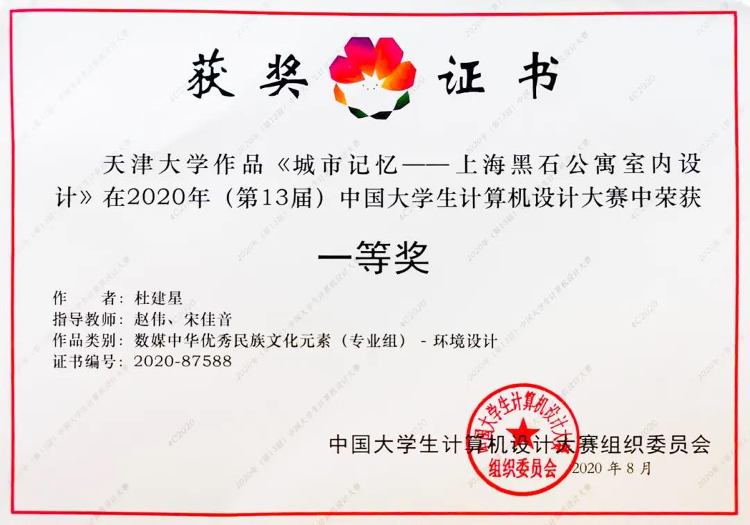 In the 13th Chinese Collegiate Computing Competition (2020), the entry "Urban Memory—Shanghai Blackstone Apartments Interior Design" from Tianjin University’s School of Architecture won the second prize in the provincial competition held online on June 27, out of 30,000 pieces of works, and the first prize in the final national round against 4645 competitors on August 14.