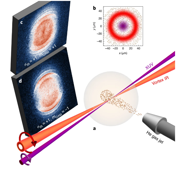 The two beams were overlapped in a helium-containing chamber. The high energy photons could eject one electron from the atoms, and the low energy photons with the orbital angular momentum could make them spin. Turning the orbital angular momentum in the opposite direction and keeping the polarization of the high energy photons fixed revealed a difference between the two situations. The results indicate the possibility to measure quantum mechanical states that are otherwise hidden to light.