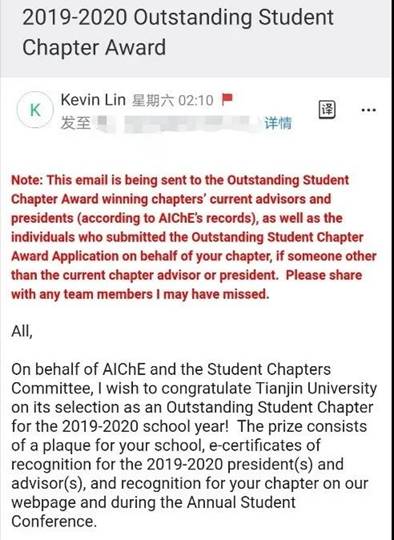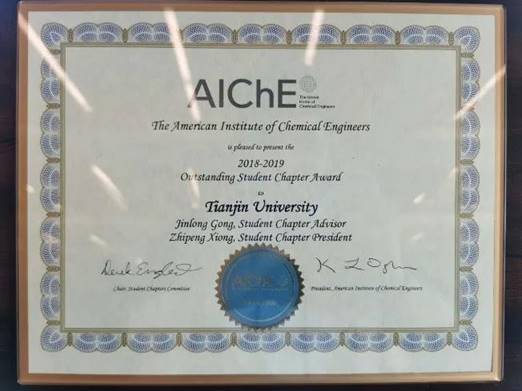 Recently, the American Institute of Chemical Engineers (AIChE) announced the 2019-2020 Outstanding Student Chapter Award winners. Tianjin University Student Chapter of AIChE has won this award for the fourth consecutive year since its establishment in 2016. It is the only mainland Student Chapter to receive this honor.
