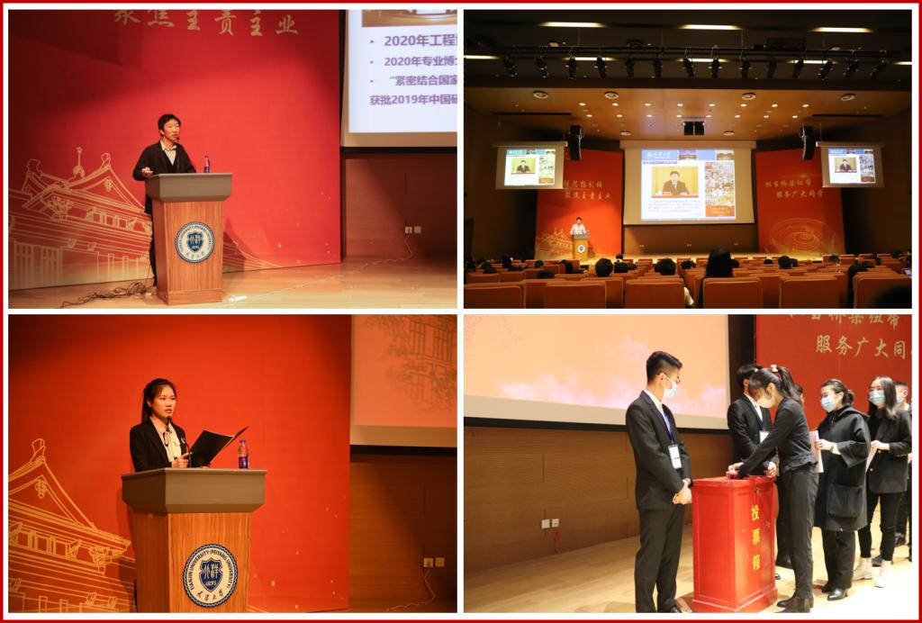 On the second session of the 37nd Graduate Representative Conference, firstly representatives passed the work report of Graduate Student Union given by Liu Shuaiyao, listened to the work proposal by Zhao Jingzhang, elected 26 postgraduates as members of the 37nd standing committee, and 5 students Weng Xing, Fu Yukun, Bai Yiming, Wang Jialin, Li Shuangyang as the presidium of the Graduate Student Union.