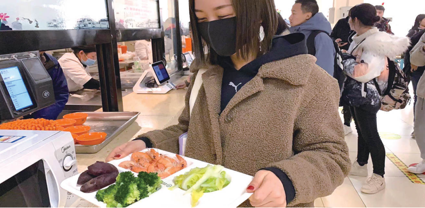 A student at Tianjin University picking up her “personalized fitness meal”, consisting of steamed purple sweet potato, boiled shrimp and broccoli.