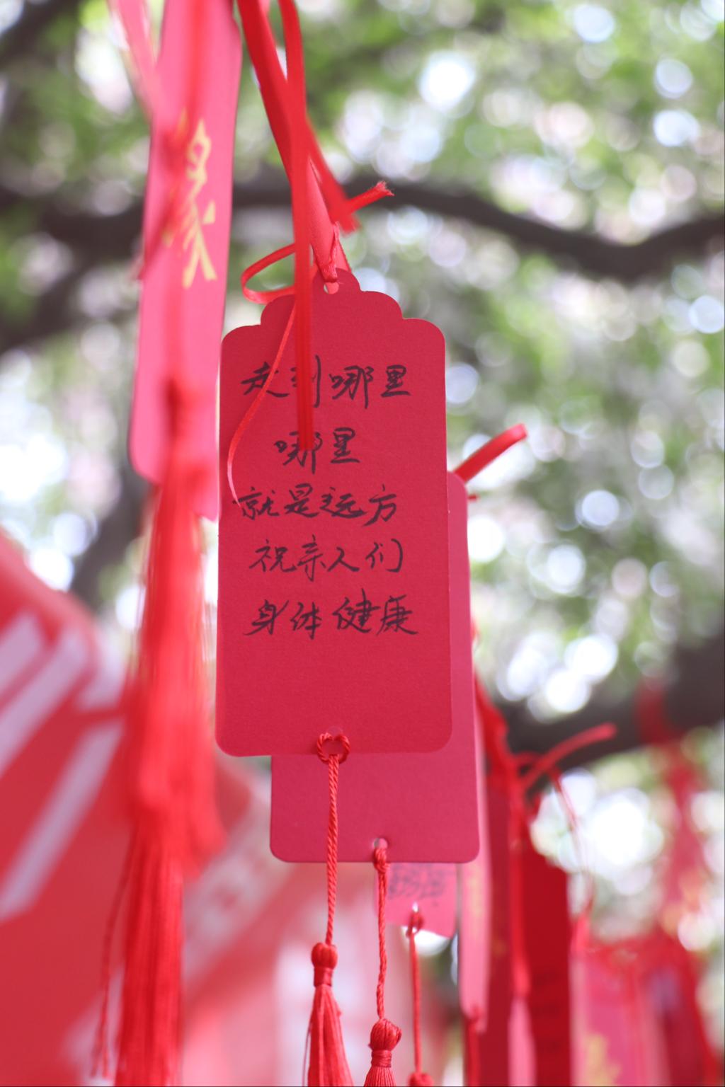 Setting off by the red-booth is a big crabapple tree with many red cards hanging on it and dancing amid the flowers with the light breeze. Some cards pray for the peace and prosperity of the country, others show resolution to pursue their academic dreams.