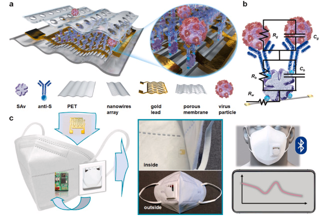 This intelligent mask integrates a high density conductive nanowire array-based immunosensor. The spacing of the nanowires is designed to match the size of the virus pathogen, which enables a highly efficient capture of the target. The nanowire array behaves like a “net” and captures exhaled coronavirus aerosols precisely.