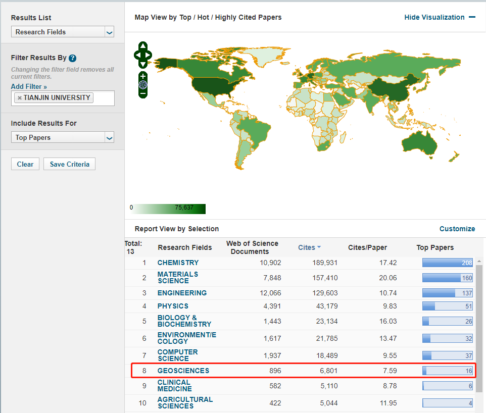 Recently, Tianjin University entered the Essential Science Indicators Top 1% list of institutions in the field of Geosciences for the first time. This means that from 2011 to 2021, the number of TJU's citations in the field of Geosciences, as ESI defines the field, is in the top 1% globally when compared to institutions also publishing in Geosciences in the last decade.