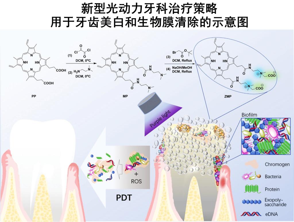 PDDT strategy is such kind of chemical bleaching technology designed by Prof. Zhang Lei’s team from Tianjin University and Prof. Zhang Xu’s team from the Stomatological Hospital affiliated to Tianjin Medical University. They synthesized a highly water-soluble, biocompatible zwitterion-modified porphyrin (ZMP) and raised the reactive oxygen species output roughly 8 times higher.